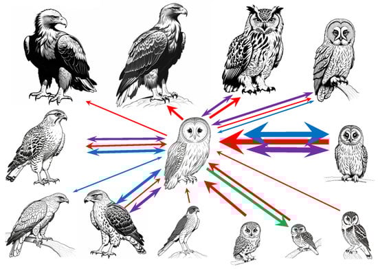 Schematic presentation of interspecific relations among Ural owls (central) and other owls and diurnal raptors in Europe according to the literature review. Red arrows—predation, blue arrows—competition for habitats/nest sites, violet arrows—competition for prey, and green arrows—protective effects. The direction of the arrow indicates dependency (an arrow toward a species means that it is the recipient). The width of the arrow corresponds to the frequency of interaction (a larger arrow means more frequent interaction or a higher “strength” of interaction). Owl and raptor images were generated in https://openart.ai/ (accessed on 2 January 2025).