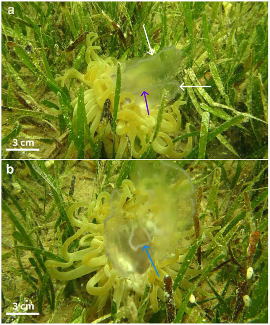 Giant sea anemone Condylactis gigantea predating moon jellyfish Aurelia sp. in Ensenada de Santa Maria, Cuba. (a) Aurelia sp. individuals (white arrow), with the subumbrella tentacles (purple arrow); (b) visible gonads (blue arrow). Photo credit: J.I. Hernández-Albernas.