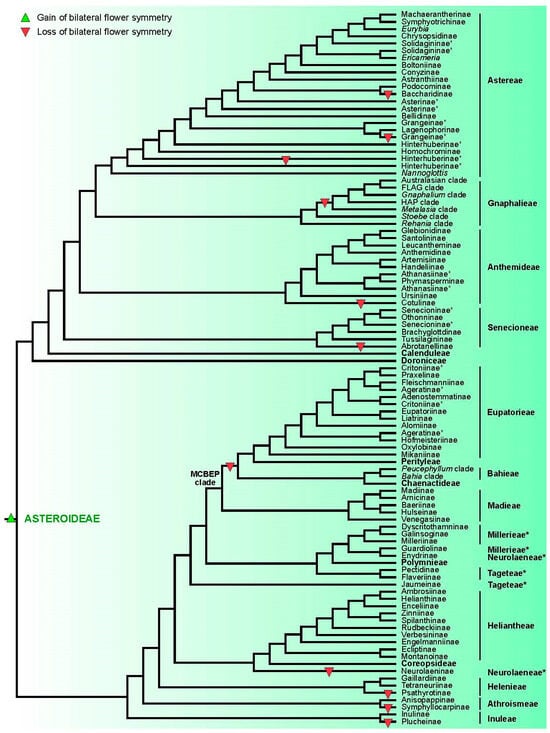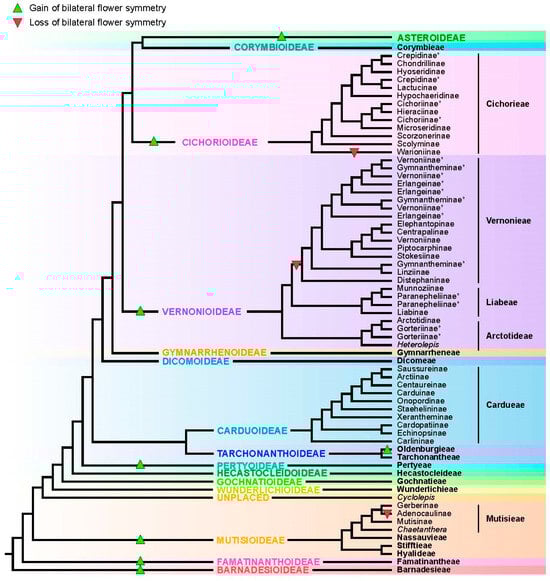 A summary phylogenetic tree of non-Asteroideae subfamilies of Asteraceae and the evolutionary history of bilateral flower symmetry in these subfamilies. The summary tree is derived from six phylogenetic trees reported by Zhang et al. []. The phylogenetic relationships among subtribes and subtribe-level clades are shown with the subtribe names to the right of branches and their tribe names on the far right; the names of tribes that are not divided into subtribes are shown in boldface as the tip names. The subfamily names are shown on the corresponding branches. The transitions of flower symmetry are indicated on branches: green triangles, gains of bilateral flower symmetry; red inverted triangles, losses of bilateral flower symmetry. The asterisks to the right of subtribe names indicate non-monophyletic subtribes. (The legends used here are also the same for Figure 2).