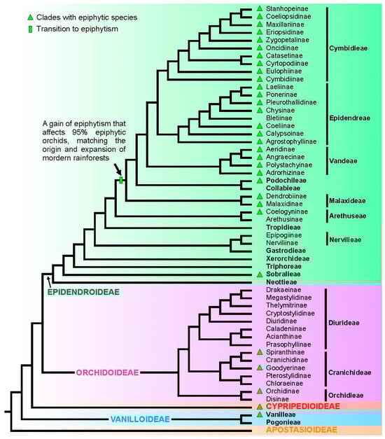 A summary phylogenetic tree of Orchidaceae and the evolutionary history of the epiphytism in the family. The summary tree is derived from four coalescent trees reported by Zhang et al. []. The phylogenetic relationships among subtribes and subtribe-level clades are shown with their tribe names to the right of the tree and the subfamily names on the corresponding branches. The names of subfamilies (all capital letters) that are not divided into tribes and subtribes and the names of tribes (boldface) that are not divided into subtribes are shown as the tip names. The clades with epiphytes were indicated using green triangles to the right of the tip. A transition from terrestrial habit to epiphytic habit is indicated using a green bar.