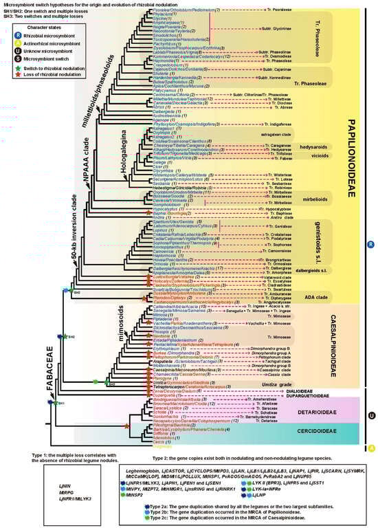 An overview of Fabaceae phylogeny and evolutionary histories of rhizobial nitrogen-fixing symbiosis. The summary phylogenetic tree was derived from seven coalescent trees, as reported by Zhao et al. [], with the tips representing genera, subtribes (Subtr), or tribes (Tr); one or more generic names are shown to the right of the branches, the subtribe/tribe names further right and subfamily names to the far right. Numbers adjacent to the generic names denote the total number of genera sampled for these condensed groups. The colors of generic names signify nodulation state: red for genera lacking nitrogen-fixing nodules, black for genera with unknown nodulation status, blue for genera with rhizobial nitrogen-fixing nodules, and yellow for the outgroup with actinorhizal nitrogen-fixing nodules. The existence and duplication patterns of key nodule gene families were inferred by phylogenetic analysis using data from 28 representative genomes and 5 publicly available transcriptomes, detailed in the bottom panel of the diagram. Among these key nodule gene families, three genes are categorized as Type 1, with multiple losses and associated with the absence of rhizobial legume nodules. The remaining 29 genes are identified as Type 2, present in both nodulating and non-nodulating legumes, see Figures 7, S26, and S28–S57 in Zhao et al. []. In the non-nodulating legumes Cercis canadensis and Nissolia schottii, belonging to the Cercidoideae and Papilionoideae subfamilies respectively, the potential loss of genes such as LjNIN, MtRPG, and LjNFR1/MtLYK3 underscores the hypothesis that the capability for nitrogen-fixing symbiosis has been independently lost multiple times. The symbiotic nitrogen fixation (SNF) clade, which includes known nodulation-related genes from both nitrogen-fixing and non-nitrogen-fixing species, suggests that gene duplications in early Fabaceae history may have facilitated a transition from actinorhizal to rhizobial nodulation, with three hypotheses (SH1, SH2, and SH3) supported by specific gene duplication. This is further evidenced by duplications of several SNF genes in early Fabaceae evolution (Type 2a), such as LjNFR1/MtLYK3, MtLYK1/MtLYK9, LjLNP, LjAPN1, and LjFEN1 within the SNF clade (Supplemental Figure S26 in Zhao et al. []), supporting SH1 for a switch to rhizobial nodulation at the MRCA of Fabaceae or even earlier. Separately, the duplication of the LjSEN1 gene at the MRCA of both Caesalpinioideae and Papilionoideae subfamilies supports SH2, while other significant gene duplications at the MRCAs of Caesalpinioideae (Type 2c) and Papilionoideae (Type 2b) support SH3.