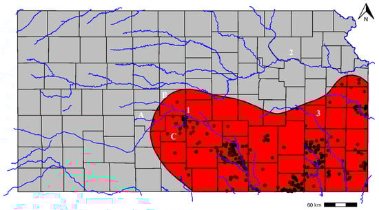 Geographic distribution of nine-banded armadillos (Dasypus novemcinctus) in the state of Kansas, United States. Shaded areas represent an 85% kernel density isopleth calculated around armadillo occurrence points, square icons denote armadillo occurrence records outside of the kernel isopleth, and blue rivers represent the major river systems. The counties are labeled by letters and rivers by digits. A—Pawnee County, B—Barton County, C—Stafford County. 1—Arkansas River, 2—Kansas River, and 3—Neosho River.