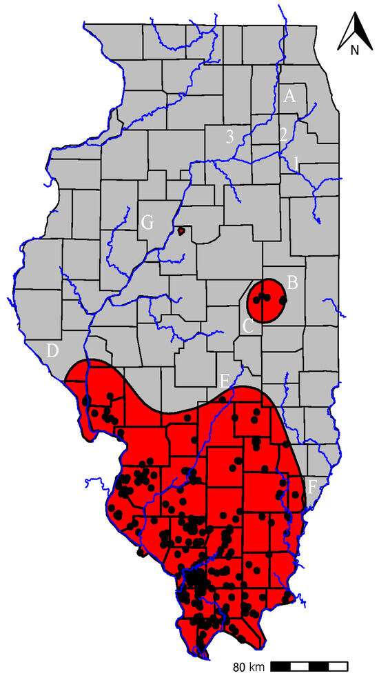 Geographic distribution of nine-banded armadillos (Dasypus novemcinctus) in the state of Illinois, United States. Shaded areas represent an 85% kernel density isopleth calculated around armadillo occurrence points, square icons denote armadillo occurrence records outside of the kernel isopleth, and blue rivers represent the major river systems. The counties are labeled by letters and rivers by digits. A—DuPage County, B—Champaign County, C—Piatt County, D—Pike County, E—Shelby County, F—Wabash County, G—Peoria County, 1—Kankakee River, 2—Des Plaines River, and 3—Fox River.