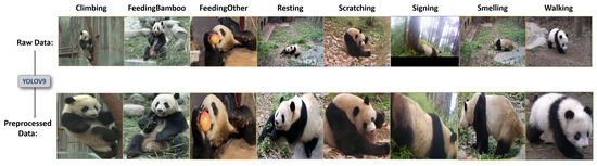 The PACV-8 dataset, as shown in the first row of Figure 7, exhibits various challenges due to the diversity in video capture angles, distances, and sources. The images typically suffer from cluttered backgrounds, small subject proportions, and inconsistent resolutions. YOLOv9 is capable of accurately detecting and isolating the giant panda as the main subject, thereby minimizing the interference of background noise in behavior recognition. By cropping and resizing the detected panda subjects to 224 × 224 pixels using YOLOv9, we effectively reduced the image size and standardized the input scale, which in turn reduced the complexity of training. Additionally, YOLOv9 preserved critical environmental information, allowing the model to better understand and recognize the behavior of the giant panda. The results after target detection are shown in Figure 7.
