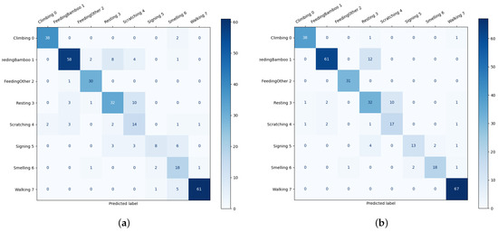 Furthermore, we demonstrated the improvement in model performance across different categories using confusion matrices, as shown in Figure 11. From the images, it can be observed that with the improvements, the recognition performance of most categories was enhanced, such as scratching, signing, walking, etc.