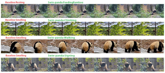 We also provide a comparison of behavior classification examples, as shown in Figure 12. In certain samples, the baseline model misclassified behaviors, such as labeling “Climbing” as “Smelling” and “FeedingBamboo” as “Resting”. In contrast, the Swin-Panda model successfully corrected these misclassifications by enhancing its attention to fine-grained information and leveraging hierarchical temporal-spatial feature analysis. In the same video clips, the Swin-Panda model accurately identified these behaviors as “FeedingBamboo”, “Climbing”, “Walking”, and “Signing”, demonstrating improved classification accuracy and robustness.