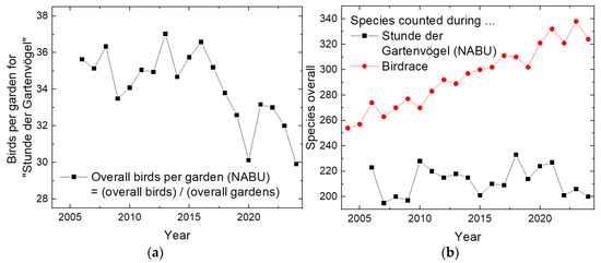 (a) Birds per garden counted during “Stunde der Gartenvögel”; (b) bird species counted during “Stunde der Gartenvögel” and Birdrace, respectively.