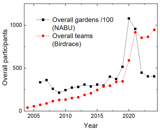 To investigate the impact of the aforementioned number of participants in both data collections, Figure 2 shows the number of gardens attending the “Stunde der Gartenvögel” and the number of teams for the Birdrace per year. Both lines show a slightly increasing trend, with a sharp increase in the years 2020 and 2021. Only the number of Birdrace teams, however, stayed on a similar level as during the COVID-19 pandemic. This may be attributed to the possibility of building “virtual teams” for the Birdrace since 2020, i.e., teams of up to five people who can divide and may even count birds in different federal states of Germany, as opposed to the “classical teams” of 3–5 people who stay together in a group [29]. In contrast, the positive impact of the COVID-19 years on the number of gardens participating in the “Stunde der Gartenvögel” has not continued after the pandemic. The significant increase in the number of Birdrace teams, however, has not led to a correspondingly strong increase in observed bird species during the Birdrace (Figure 1b).