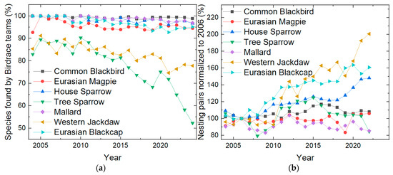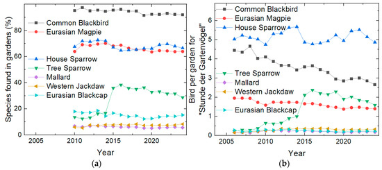 The percentage of gardens in which a specific bird species is found during the “Stunde der Gartenvögel” is shown in Figure 3a. Generally, slightly decreasing trends can be observed for the Common Blackbird, Eurasian Magpie, House Sparrow, and Eurasian Blackcap (data are only available starting from 2010). These birds are easy to identify, similar to the Mallard (while the female Mallard can easily be confused with some other female ducks, no other ducks are usually expected to be found in gardens, so the risk of counting any other duck as Mallard is very low) and the Western Jackdaw, which show approximately constant trends. For the Tree Sparrow, there is a remarkable sudden increase from 2014 to 2015, potentially due to confusion with the House Sparrow, which will be discussed in Section 3.2.