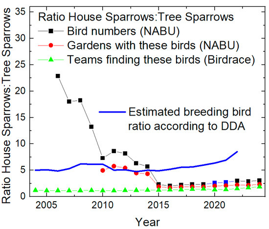 Ratio of House Sparrows to Tree Sparrows according to the “Stunde der Gartenvögel” (counting bird numbers, black dots; and counting gardens with these birds, red dots) and to the Birdrace (green dots). The blue line shows the estimated breeding bird ratio according to the DDA data [33,34].