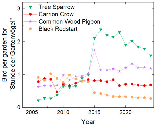 As mentioned before, the development of the Tree Sparrow poses two questions: on one hand, an explanation for the sudden increase in Tree Sparrows from 2014 to 2015 in the “Stunde der Gartenvögel” is necessary; on the other hand, the decline of the Tree Sparrow according to the Birdrace and to Ref. [28] needs to be investigated (Section 3.3).