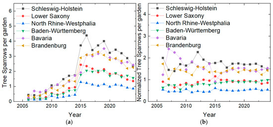 (a) Percentage of gardens with Tree Sparrows during “Stunde der Gartenvögel”, split according to different federal states; (b) percentage of gardens normalized to the overall values for Germany (from Figure 3a).