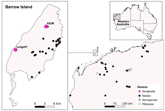 - Humphreys, G.; Alexander, J.; Harvey, M.S.; Humphreys, W.F. The subterranean fauna of Barrow Island, north-western Australia: 10 years on. Rec. West. Aust. Mus. Supp. 2013, 83, 145–158. [Google Scholar] [CrossRef][Green Version]