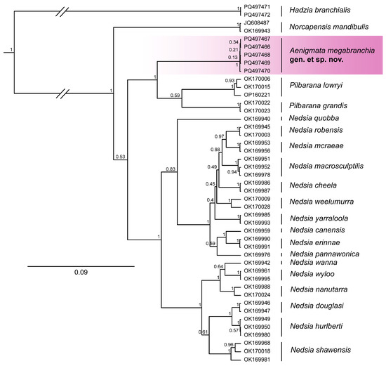 - King, R.A.; Fagan-Jeffries, E.P.; Bradford, T.M.; Stringer, D.N.; Finston, T.L.; Halse, S.A.; Eberhard, S.M.; Humphreys, G.; Humphreys, B.F.; Austin, A.D.; et al. Cryptic diversity down under: Defining species in the subterranean amphipod genus Nedsia Barnard & Williams, 1995 (Hadzioidea: Eriopisidae) from the Pilbara, Western Australia. Invertebr. Syst. 2022, 36, 113–159. [Google Scholar] [CrossRef]