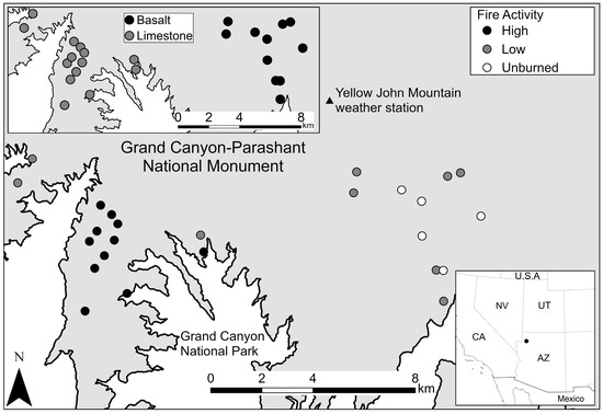 Location of 25 study plots (classified according to fire activity in the main image and according to soil parent material in the inset) in pinyon–juniper communities in Grand Canyon-Parashant National Monument, Arizona, USA. The fire activity classification integrates the number of fires and time since fire and is detailed in Figure S1. Plots burning the most times (up to four times) and with more recent fires were in the high fire activity group. Plots experiencing fewer fires and with a longer time since fire (up to 43 years) were in the low fire activity group. Plots with no history of fire since at least the 1970s were classified as unburned (Table S1).