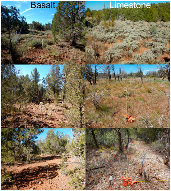 Example photographs from 6 plots (of 25 total) sampled to study variation across pinyon–juniper communities with different fire histories and soil parent materials in Grand Canyon-Parashant National Monument, Arizona, USA. For the example plots on basalt soil, from top to bottom photographs, fire history included 1 fire and time since fire (TSF) = 19 years, 1 fire and TSF = 28 years, and unburned. For the example plots on limestone soil, from top to bottom photographs, fire history included 4 fires and TSF = 5 years, 2 fires and TSF = 13 years, and 1 fire and TSF = 43 years. The photographs were taken in summer 2023 by University of Nevada Las Vegas research staff.