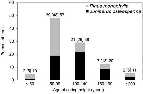 The third limitation was challenges also extensively noted in the literature with cross-dating Juniperus trees, resulting in many studies including ours to focus on ring counts or minimum ages for likely partially dated trees [20,43,44]. There can also be variation among sites in the time trees require to grow to coring height [20]. This can be estimated by sampling growth rate to coring height in contemporary seedlings, but this may not match the time required in previous centuries for the oldest trees. Retrospectively determining this typically necessitates cutting cross-sections at the root collar (and comparing with the age at coring height) via the destructive sampling of old trees, which was not appropriate in our study in a national park setting. We sought to minimize limitations with cross-dating by grouping trees into 50-year age classes to enable approximate comparisons between broad time periods, such as circa pre- or post-1870s representing general land use change associated with settlement in the study region [24].