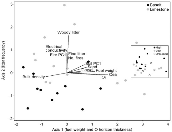 Principal component analysis of fuel variables in pinyon–juniper communities in Grand Canyon-Parashant National Monument, Arizona, USA. Points in the ordination are plots, symbolized according to soil parent material in the main image (and by fire activity in the inset), arranged based on their similarity to each other among fuel variables. Vectors (r2 ≥ 0.20) display fuel variables (woody fuel weight and O horizon thickness for Axis 1 and fine and woody litter frequency for Axis 2) most strongly correlated with their own ordination axes and the habitat variables most strongly correlated with the fuel variables. For habitat variables, soil properties (e.g., bulk density) are for the 0–5 cm mineral soil. The soil and fire principal components (PCs) are composite variables from Figures S1 and S2. Soil properties on basalt compared with limestone soil are shown in Table S2.