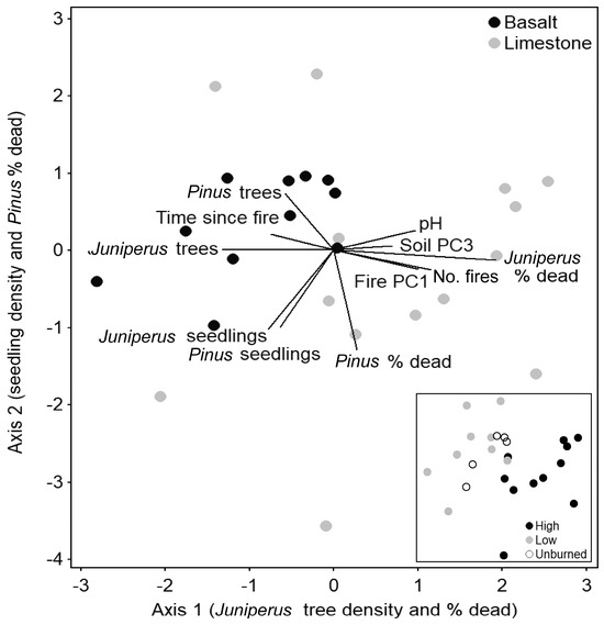 Principal component analysis of tree variables in pinyon–juniper communities in Grand Canyon-Parashant National Monument, Arizona, USA. Points in the ordination are plots, symbolized according to soil parent material in the main image (and by fire activity in the inset), arranged based on their similarity to each other among tree variables. Vectors (r2 ≥ 0.20) display tree variables most strongly correlated with their own ordination axes and the habitat variables most strongly correlated with tree variables. For tree variables, seedlings and trees are individuals/ha and % dead is for trees. For habitat variables, soil properties (e.g., pH) are for the 0–5 cm mineral soil. The soil and fire principal components (PCs) are composite variables from Figures S1 and S2.