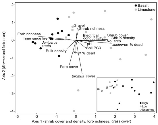 Principal component analysis of understory variables in pinyon–juniper communities in Grand Canyon-Parashant National Monument, Arizona, USA. Points in the ordination are plots, symbolized according to soil parent material in the main image (and by fire activity in the inset), arranged based on their similarity to each other among understory variables (grass cover is for native perennials; Bromus is the non-native annual B. tectorum). Vectors (r2 ≥ 0.20) display understory variables most strongly correlated with their own ordination axes and the habitat variables most strongly correlated with understory variables. For habitat variables, soil properties (e.g., pH) are for the 0–5 cm mineral soil (PC = principal component from Figure S2). Tree variables are for individuals/ha or the % of trees that are dead.