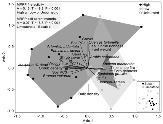 The multi-response permutation procedure tests supported the separation of community compositional groupings portrayed in the ordination according to gradients of fire activity and soil parent material. Each fire activity category (high, low, unburned) and soil parent material (basalt, limestone) displayed unique community composition (Figure 7 inset).