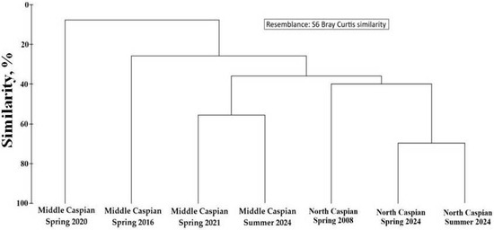 - Kurochkina, T.F.; Nasibulina, B.M.; Bakhshalizadeh, S.; Popov, N.; Kuanysheva, G.; Fazio, F.; Ali, A.M. Plankton Community Structure and Biomass in the Eastern Middle Caspian Sea. Water 2023, 15, 138. [Google Scholar] [CrossRef]