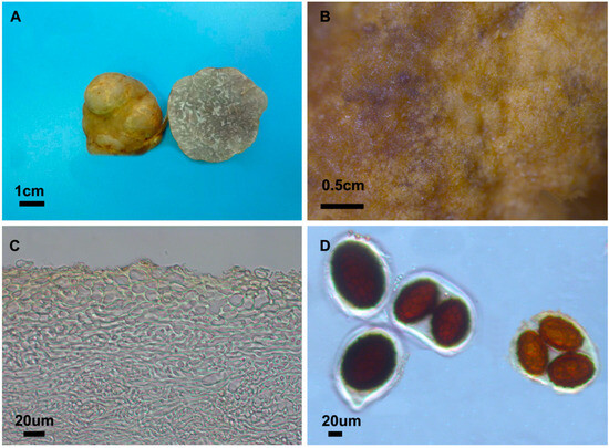 Ascomata (Figure 1A) globose, subglobose, or ovoid, 1.4–2.3 cm; surface (Figure 1B) yellow-white when immature, yellow-brown to brown when mature, with yellow grooves and warty or scaly protrusions; brown when dried. Gleba (Figure 1A) light yellow when immature, purple-brown to brown when mature, composed of transparent interwoven hyphae, 2–6 μm in dim; clearly visible spores. Peridium (Figure 1C) 123–164 μm thick, one layer, prosenchymatous, composed of subglobose cells and interwoven hyphae; cells (5.6–)6–34 × 2.2–13(–14) μm; hyphae 1.2–5.5 μm in diam. Asci (Figure 1D) elliptical or irregularly spherical, 102–149(–151) × 82–84(–147) μm, translucent, mostly containing one spore, occasionally 2–3 spores. Ascospores (Figure 1D) elliptical, transparent or pale yellow when immature, reddish-brown when mature, without ornamentation; 1-spored 77–101(–102) × 57–72(–74) μm, 2-spored 60–74(–76) × 45–54(–56) μm, 3-spored (57–)59–61(–62) × (37–)39–46 μm, with a length-to-width ratio Q = 1.34–1.54, Qm = 1.38 ± 0.04. Ornamented with alveolate reticulum, less than 2 μm high, composed of irregular pentagonal or hexagonal meshes, with 4–9 meshes present.