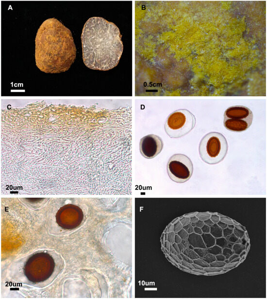 Ascomata (Figure 2A,B) spherical to sub-spherical, 0.8–5 cm in diameter. Immature ascomata yellow-white to pale brown, mature specimens light brown to brown, sometimes with brown spots or a yellow-green hue, smooth surface or shallow yellow warts, often covered in golden-yellow or brown fluff. Gleba white when young, turning light brown to black at maturity; distinct marbled mycelial strands, wide or narrow. Peridium (Figure 2C) brown-yellow to brown, 140–260 μm thick, one layer, prosenchymatous, loose tissue, near-spherical cells interwoven with hyphae; hyphal diameter 1.3–2.6 μm. Asci (Figure 2D,E) elliptical or nearly spherical, 121.9–159.9 × 105.7–152.2 μm, transparent, typically containing one spore, rarely two, no stalk. Ascospores (Figure 2F) elliptical, occasionally nearly spherical, colourless or pale yellow when immature, turning red-brown or brown when mature, without ornamentation; 1-spored 79.2–109 × 62.5–75.5 μm, Q = 1.04–1.62, Qm = 1.43 ± 0.12 (n = 60); 2-spored 85–112.3 × 49.4–61.8 μm, Q = 1.5–2.07, Qm = 1.74 ± 0.18 (n = 12). Ornamented with alveolate reticulum, less than 2 μm high, irregularly arranged shallow honeycomb-like meshes, 6–9 vertical meshes and 4–11 horizontal meshes.