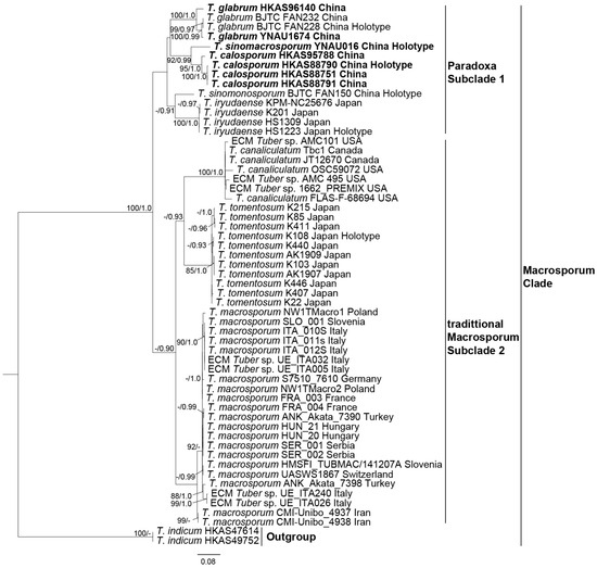 The traditional subclade Macrosporum contains three species (Figure 3). These include the Japanese T. tomentosum and the North American T. canaliculatum, both with spherical to nearly spherical spores [9,12,34]. However, the spores of T. tomentosum are smaller (27–64 × 26–55 μm) than those of T. canaliculatum (48–72 × 40–52(–64) μm. The European T. macrosporum has elliptical ascospores (Q = 1.6–1.7) [3,35], which were well distinguished from those of the other two species.