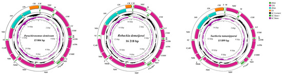 The complete mitogenome of Parachironomus demissum was 15,804 bp, Robackia demeijerei was 16,218 bp, and Saetheria tamanipparai was 15,899 bp long. The typical double-stranded circular DNA molecule, characteristic of insect mitochondrial genomes, contains a total of 37 genes—including 13 protein-coding genes (PCGs), 22 tRNA genes, and two rRNA genes—as well as one control region, with the gene-coding strand following the standard arrangement. (Figure 1).