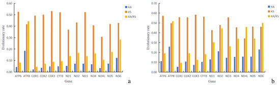 Evolution rate of 13 PCGs of the subfamily Chironominae in mitogenomes, (a): Harnischia generic complex, (b): other genera within Chironominae. Ka and Ks represent non-synonymous and synonymous nucleotide substitutions, respectively, with their ratio, Ka/Ks, indicating the selection pressure on protein-coding genes (PCGs). The plot’s x-axis shows 13 PCGs, and the y-axis shows Ka/Ks values.