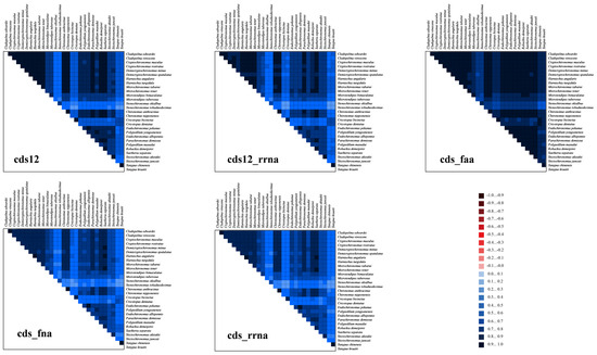 The examination of heterogeneity divergence differences offers insights into the mitochondrial gene sequence similarities among various species. It is worth noting that due to codon degeneracy, the cds_faa dataset exhibited the lowest level of heterogeneity, whereas the cds_rrna dataset demonstrated a notably higher degree of heterogeneity (Figure 3).