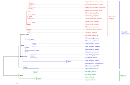Phylogenetic research on the Harnischia generic complex has historically been underdeveloped, with contentious boundaries and taxonomic statuses of its genera, including the presence of monotypic genera [14]. This has, to a certain extent, impeded systematic phylogenetic studies within the Chironominae subfamily [17]. Previous studies, constrained by limited morphological traits or short molecular sequences and regionally confined sampling, have resulted in numerous conflicting hypotheses due to the incompleteness of samples and characteristics [14]. Therefore, extensive global sampling and the integration of multi-characteristic data for comprehensive analysis are essential to elucidate the phylogenetic relationships within the Harnischia generic complex, thereby fostering advancements in the phylogenetic research of the Chironomidae family [18].