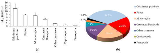 Composition of the total catch in terms of biomass (mL/10,000 m3): (a) average catch rate values for different taxa (bars = SE) and (b) average percentage composition.