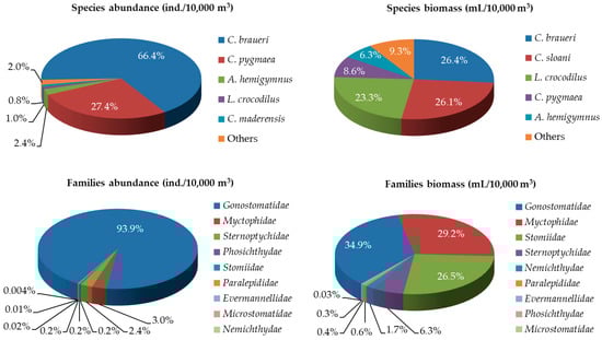 Percentages of the most represented species and families in terms of abundance (ind./10,000 m3) and biomass (mL/10,000 m3).