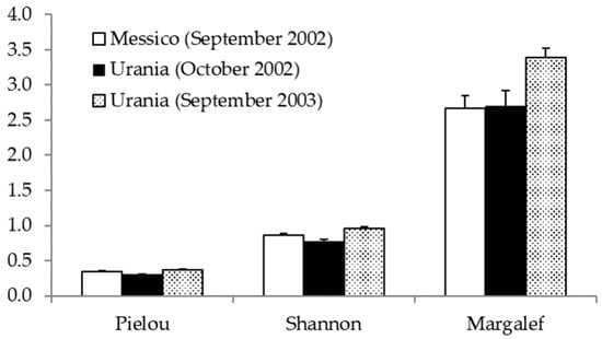 Average values of biodiversity indexes in the three surveys (bars = SE).