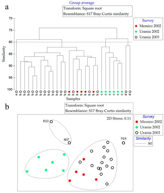 Similar results were obtained by the MDS analysis, which confirmed the presence of two main groups characterized by the samples from the Urania 2002 survey (group c) and by a group comprising the stations of Messico 2002 and Urania 2003 (group b) (Figure 6b). Three hauls, namely 807, 810, and 918 (Urania 2003), had anomalous results.