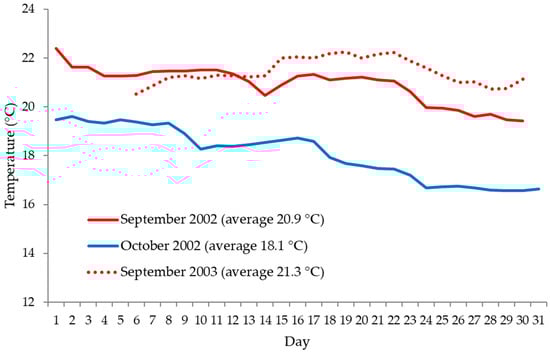 This effect could be related to the variation in the water temperature of the superficial layer (0–10 m), as detected by the DYFAMED buoy that, in September (Messico 2002 and Urania 2003), showed higher results (~20.9 °C (SD = 0.1) and ~21.3 °C (SD = 0.2)) than in October (Urania 2002) (~18.1 °C (SD = 0.1)) (Figure 7).