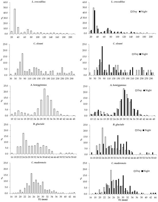 Length–frequency distributions of five mesopelagic species: on the left is the total sample, and on the right, the day/night samples are separated.