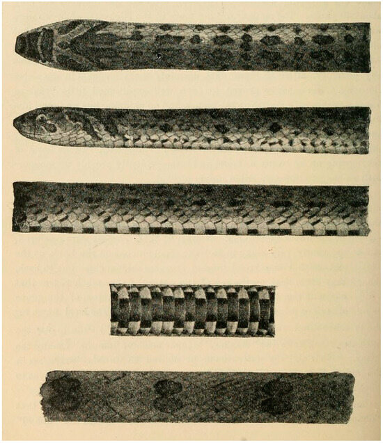 Wall [8] did not specify the number of specimens available when he introduced the name ‘juglandifer’. In 1911, Wall [10], while elevating the nomen to a full species rank too, he did not specify the number of specimens available to him, and this work largely seemed to be based on dentition. However, in 1923 [15], he stated that the type was in BNHM (now BNHS) and not in BMNH (now NHMUK). Smith [13], in his account of the species, states that the type is lost. In recent times, the specimen BMNH 210 has been listed as the holotype [35,36]. A search through the collection of BNHS resulted in the discovery of a specimen that bore a metal label ‘210’ and a new number, BNHS 814B. The specimen was collected by Frank Wall from Tindharia, Durjeeling (=Tindharia, Darjeeling District., West Bengal State, northeast India) and is the type as other specimens collected by him were either O. cyclurus or O. albocinctus (Patel & Mirza pers. obs.). Furthermore, the specimen matches the scalation data and sketch (Figure 1) provided by Wall [8,11]. Thus, the specimen BNHS 814B (ex-210) is the holotype of Oligodon juglandifer. Wall [11], in his hand list of snakes of the Indian empire, stated that the type specimen is at BNHS, mentioned the measurement as 717 mm, which we believe is the largest specimen of the species available to him and not the type specimen. Wall [11] mentioned the largest length of all the species in his hand-list and not the type specimens. Wallach et al. [36] likely misinterpreted this and stated that the type is 717 mm, but the holotype measures 430 mm.