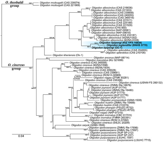 - Lee, J.L.; Yushchenko, P.V.; Suwannapoom, C.; Pawangkhanant, P.; Grismer, L.L.; Van Nguyen, T.; Deepak, V.; Narayanan, S.; Das, S.; Neang, T. A Multi-Gene Phylogeny of the Asian Kukri Snakes (Oligodon Fitzinger, 1826): Sharpening the Blade of the Second Largest Serpent Radiation (Reptilia: Squamata: Colubridae). Mol. Phylogenet. Evol. 2024, 201, 108215. [Google Scholar] [CrossRef] [PubMed]