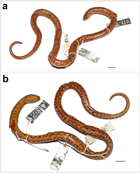 Ventral scales were counted following Dowling (1951a). The numbers of dorsal scale rows were counted at the 10th ventral, midbody, and at 10th ventral before the vent, respectively. Subcaudal counts reported here do not include the terminal scute. The number of supralabials in contact with the eye is given in brackets next to the number of supralabials. Values for symmetric head characters are given in right-to-left order. The description style follows Patel et al. [20] and Mirza et al. [21] with some modifications. Scalation and other comparable characters are described as ventral scales (V); subcaudal scales (SC); dorsal rows of scales (D); supralabial scales (SL); loreal scales (L); preocular scales (PreO); postocular scales (PostO,); temporal scales (T); infralabial scales (IL); snout–vent length (SVL); tail length (TaL); total length (TL). Measurements were taken with the help of a digital caliper to the nearest 0.1 mm, and those for snout–vent length (SVL) and tail length (TaL) were taken with the aid of a piece of string, which was then measured using a scale. Number of scales bordering the posterior border of the Parietals were counted, these exclude the temporal scales. Measurements were taken with the help of a digital caliper to the nearest 0.1 mm, and those for snout–vent length (SVL), and tail length (TaL) were taken with the aid of a piece of non-elastic string, which was then measured using a scale. Scale reduction was recorded as per Dowling [22] with modifications as in Mirza et al. [7]. An unpaired Student’s t-test and f-test for selected morphological traits.