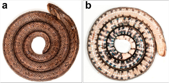 - Smith, M.A. Fauna of British India, Ceylon and Burma, Including the Whole of the Indo-Chinese Sub-Region. Reptilia and Amphibia; Taylor and Francis: London, UK, 1943; Volume 3, Serpentes. [Google Scholar]
