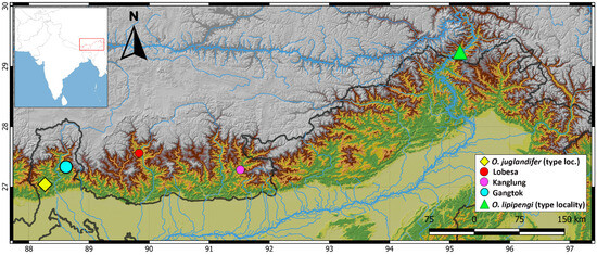 Natural history notes and distribution: Two individuals were observed actively moving among low bushes during the day. One of these individuals BNHS 3770, was seen entering a burrow following an Ablepharus sp. on a sunny morning. The species appears docile and did not attempt to bite upon handling. Most records of the species have been from the immediate vicinity of the type locality, Darjeeling. In recent years, the species has been reported from Bhutan, and the present synonym of O. lipipengi extends the species range to Medog County, China (Figure 7). In the original description O. lipipengi syn. nov., the authors report the species from Nepal, too, based on a sequence, but no further details are presented. The occurrence of the species in Nepal is quite likely as the region shares a similar and continuous habitat.