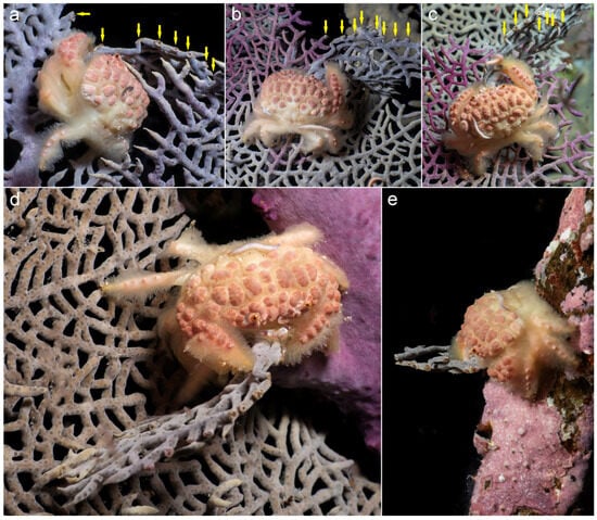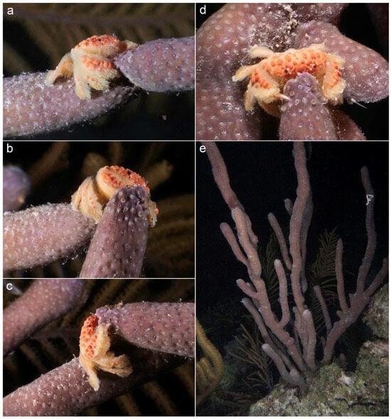 A hoary rubble crab, Banareia palmeri, cutting off a branch tip of a sea rod, Pseudoplexaura sp., in the southern part of Bonaire (2024). Dive site: Tori’s Reef (12°04′15″N 68°16′50″W), 8 m depth. (a) Crab on top of the sea rod cutting the branch. (b) The branch tip is loose and taken by the crab. (c,d) The crab is carrying the branch tip downward. (e) Overview of the sea rod. Photo credits: L.A.O.L.