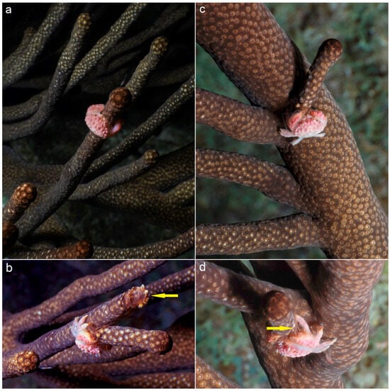 A hoary rubble crab, Banareia palmeri, cutting and transporting a small branch of a plexaurid octocoral during a night dive in the northern part of Bonaire (2020). Dive site: Bruce’s Rappel (12°13′04″N 68°20′40″W), 5–6 m depth. (a) The crab cutting the branch. (b) The coral branch is severed and excretes mucus at the wound (arrow). (c). The detached branch is carried downward. (d) The crab and the branch are partly covered by sticky coral mucus. Photo credits: L.A.O.L.