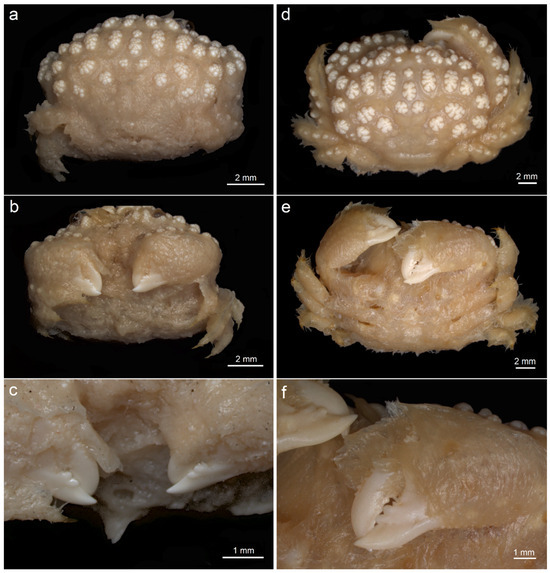 Ethanol-preserved museum specimens (Naturalis Biodiversity Center, Leiden) of Banareia palmeri showing habitus and claws: (a–c) small female (carapace 0.9 cm wide) from Bonaire, Lac Boca, behind the reef, October 1948 (RMNH.CRUS.D.8166); (d–f) large male (carapace 1.8 cm wide) from the Dominican Republic, SW of Isla Beata, 19 July 1970 (RMNH.CRUS.D.29064); (a,c) dorsal sides; (b,d) ventral sides; (c,f) close-ups showing the sharp-edged teeth of the saw-shaped inner edges of the claws. Photo credit: M.W.