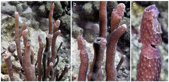 - Lasker, H.R. Asexual reproduction, fragmentation, and skeletal morphology of a plexaurid gorgonian. Mar. Ecol. Prog. Ser. 1984, 19, 261–268. [Google Scholar] [CrossRef]