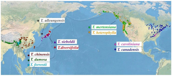 Geographic distribution of each species of Tsuga (revised from [1]).