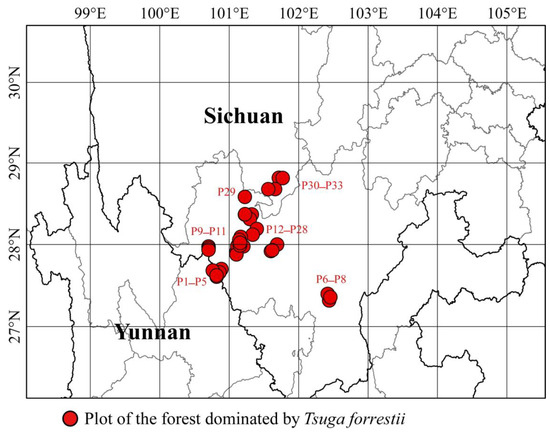 The locations of 33 plots of forests dominated by Tsuga forrestii.